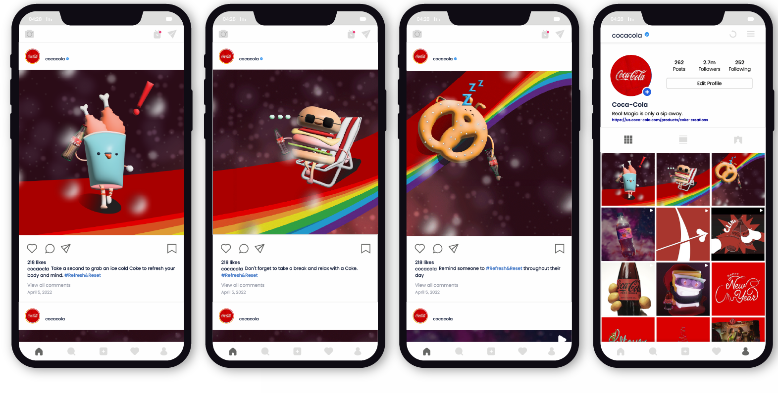 This campaign continues Coca-Cola’s strategy of emphasizing the brand over the product with its new slogan, "Refresh & Reset." By experimenting with trending design styles and utilizing 3D rendering, "Refresh & Reset" introduces unique and playful food characters that pair perfectly with a cold Coca-Cola, showcased on their Instagram. In addition to social media advertising, the campaign aims to create a strong emotional connection through engaging storytelling in a 60-second commercial in regards to shared experiences and celebration.