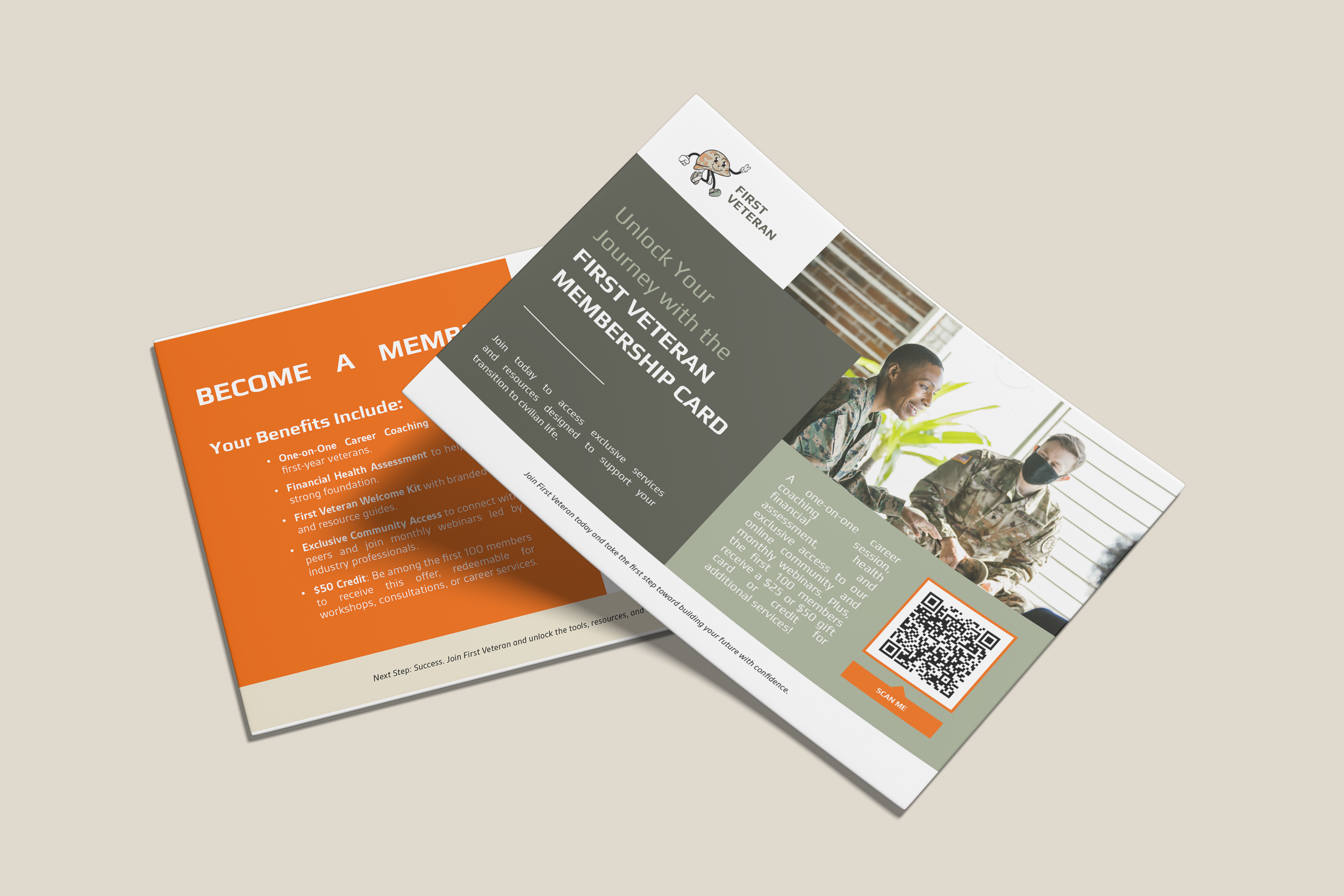 First Veteran empowers first-year military veterans by providing personalized career coaching, financial planning, and wellness resources. By creating cohesive branding through brand guidelines, marketing materials, visual infographics, and a personal website, we ensure a seamless and impactful experience. With access to exclusive offers, a supportive community, and expert-led guidance, we help veterans navigate their transition and build a strong foundation for success.